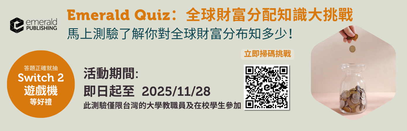 活動辦法:Emerald eJournal Quiz 測驗|全球財富地圖大測驗 Quiz連結: https://forms.office.com/e/4su4E3MGDQ 獎項: 每週加碼|星巴克禮券 × 每週 1 名 共七週 活動辦法: |