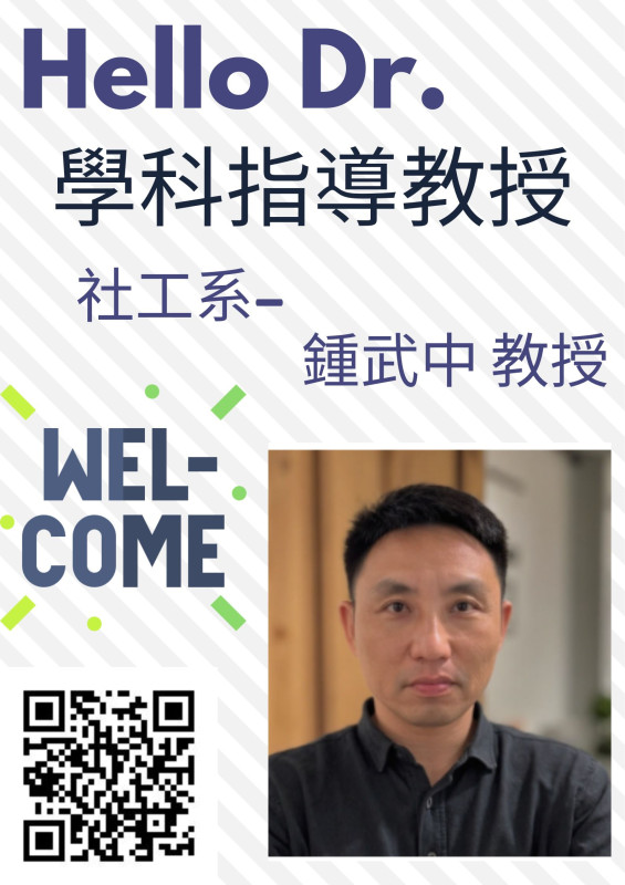 社工系 鍾武中教授研究專長為社會工作督導(Social Work Supervision)、社區工作(Community Work)、非營利組織管理(Nonprofit Organization Management)及身心障礙與老人服務(Disability and Elderly Services),且曾任輔仁大學社會工作系專案助理教授、台北海洋科技大學健康照顧社會工作專案助理教授、中華民國微光社會福利協會總督導/秘書長及犯罪被害人保護協會_新竹及桃園分會外聘督導,學經歷相當豐富! 本學期擔任圖書館學科指導教授,每週一,16:30~17:20於圖書館2樓學科指導教授服務櫃台值班。 歡迎同學們踴躍預約喔! |