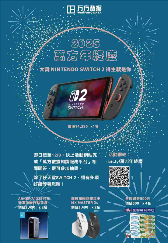 光陰似箭,一年即將又要過去,你今年過得如何?務必要記得,若想查找學術論文,就得上中國最大學術資料庫之一的《萬方數據知識服務平台》,保你未來課業、工作都一帆風順! 即日起到114/12/03,快上「萬方年終慶」有獎徵答活動網站,依照指示答對所有題目,即可參加抽獎。萬方今年送你最新最夯的任天堂SWITCH 2(是2唷~)和各項頂級3C實用好禮! 活動名稱:「萬方年終慶」有獎徵答抽獎活動。 萬方Facebook粉絲專頁公告:https://cyut.tw/qHJ
